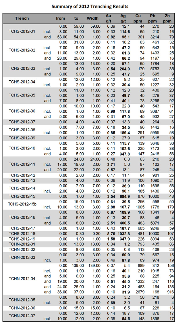 The channel sampling results are primarily from the South Chinchillones polymetallic vein corridors and the upper stratigraphic and marginal areas of the Chinchillones breccias areas. The sampling results are summarized in the following table. The veins contain widespread concentrations of gold and silver including some that may be economically significant either alone or probably more importantly when superimposed upon earlier porphyry/diatreme breccia complex mineralization. The exposed marginal parts of the diatreme breccia complex also contain localized Au and Ag.