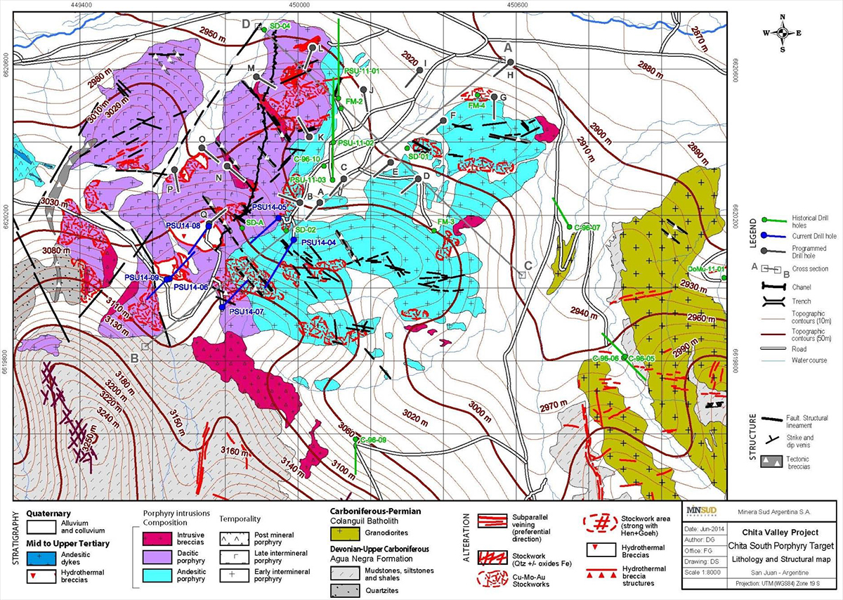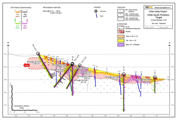 TORONTO, ONTARIO – Minsud Resources Corp. (TSX-V: MSR) (“Minsud” or the “Company”) recently completed a 6 hole, 1,122 meter diamond drilling program in the Chita South Porphyry sector of the Chita Valley Project. The program tested targets identified during the systematic multidisciplinary exploration program conducted in the sector in 2013 and more detailed work conducted in the first quarter of 2014. The drill holes tested a substantial zone of Cu-Ag-Mo-Au mineralized multi-stage vein systems and hydrothermal breccias in the southeastern border zone of the sector.