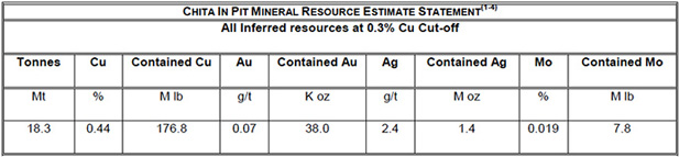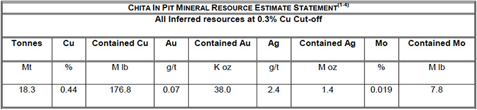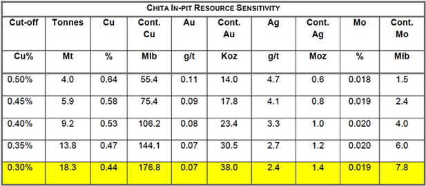 Mineral resources are sensitive to the selection of a reporting Cu cut-off grade. The sensitivities of the Cu cut-off are demonstrated in the following table for the Chita open pit resource.